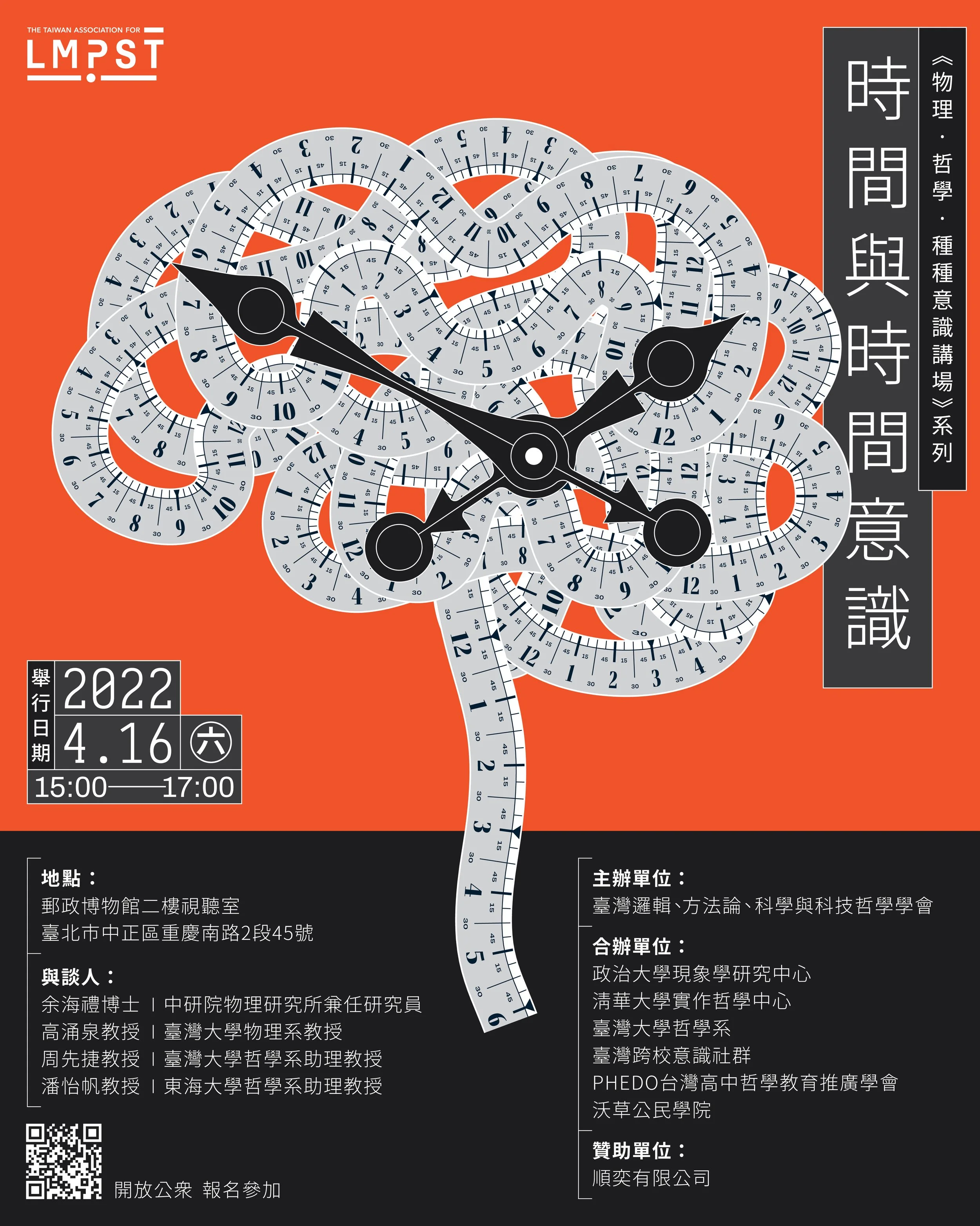 《種種意識講場》系列由臺灣邏輯、方法論、科學與科技哲學學會(臺灣LMPST學會)聯同多個組織合辦,以建立哲學與其他領域的橋樑,並面向公眾為目標。本場次〈時間與時間意識〉即為物理學與哲學的對話,有幸邀得物理學家余海禮博士與高涌泉教授,以及哲學家周先捷教授與潘怡帆教授,與大家分享見解!